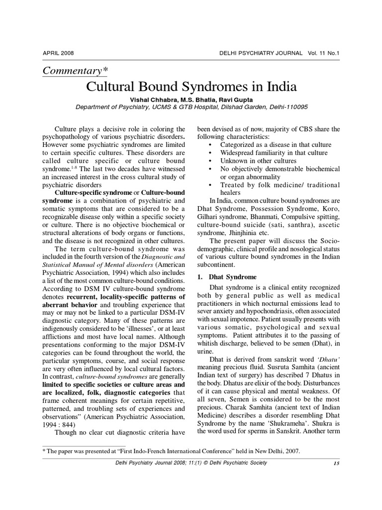 Culture bound syndrome in india. The description of four cases. A folk diagnostic term used in India to refer to severe anxiety and hypochondriacal concerns associated with the discharge of semen whitish discoloration of the urine and feelings of weakness and exhaustion. Kulhara and Chakrabarti studied Culture and schizophrenia and other psychotic disorders and observed that there is certain uniformity to the way schizophrenia presents globally.