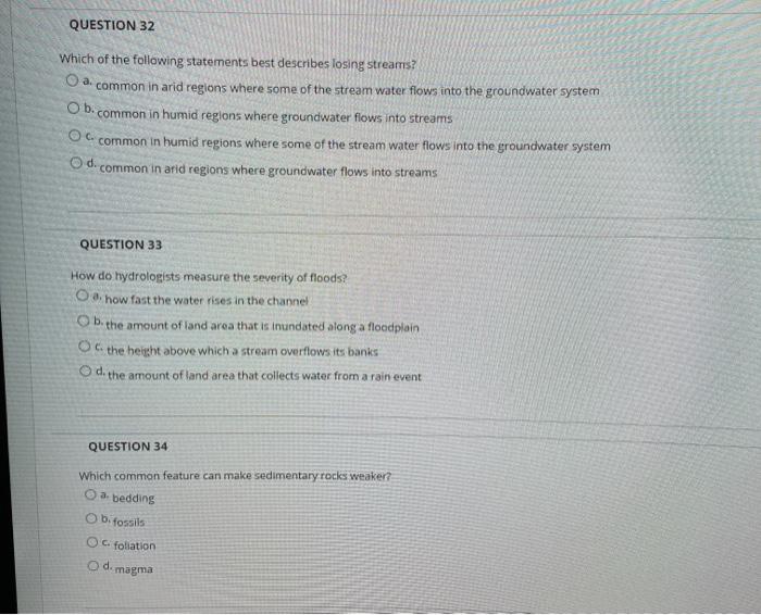 35 Which of the following agencies are responsible for enforcing the sanctions for non-participation in the NFIP. WHICH OF THE FOLLOWING BEST DESCRIBES FLOODPLAINS. Which statement best describes the process by which a stream creates a channel.