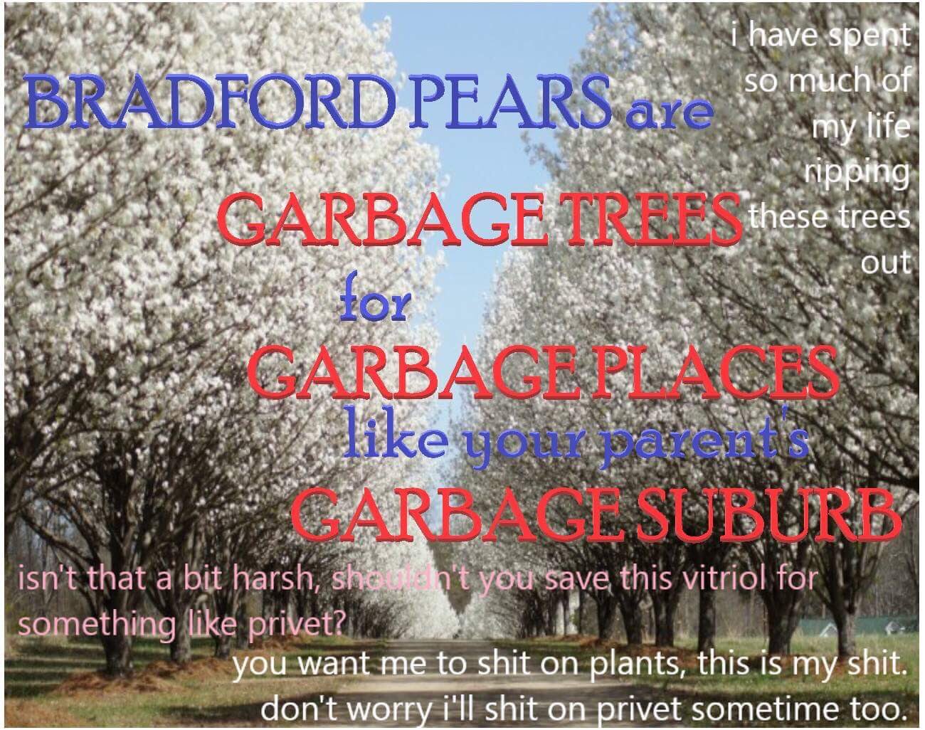 Bradford pear tree smell meme. If the Bradford pear tree were a celebrity it would no doubt be looking for a new publicist. Chainsaw was a bit dull at this point. They smell like fish theyre rude to neighboring trees and their branches are weak and often land in your or your neighbors yard.